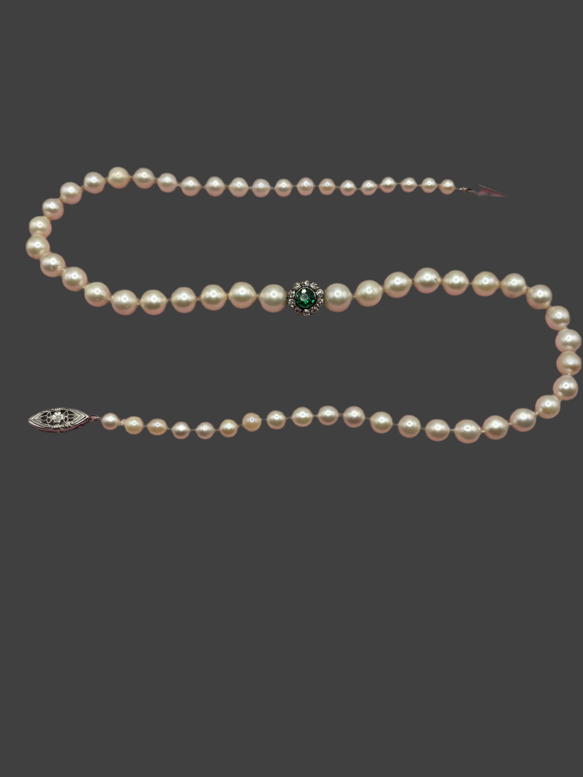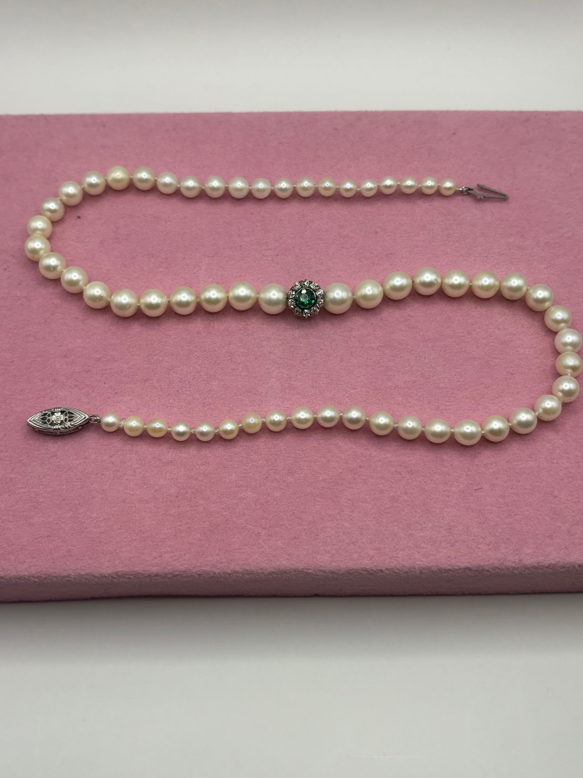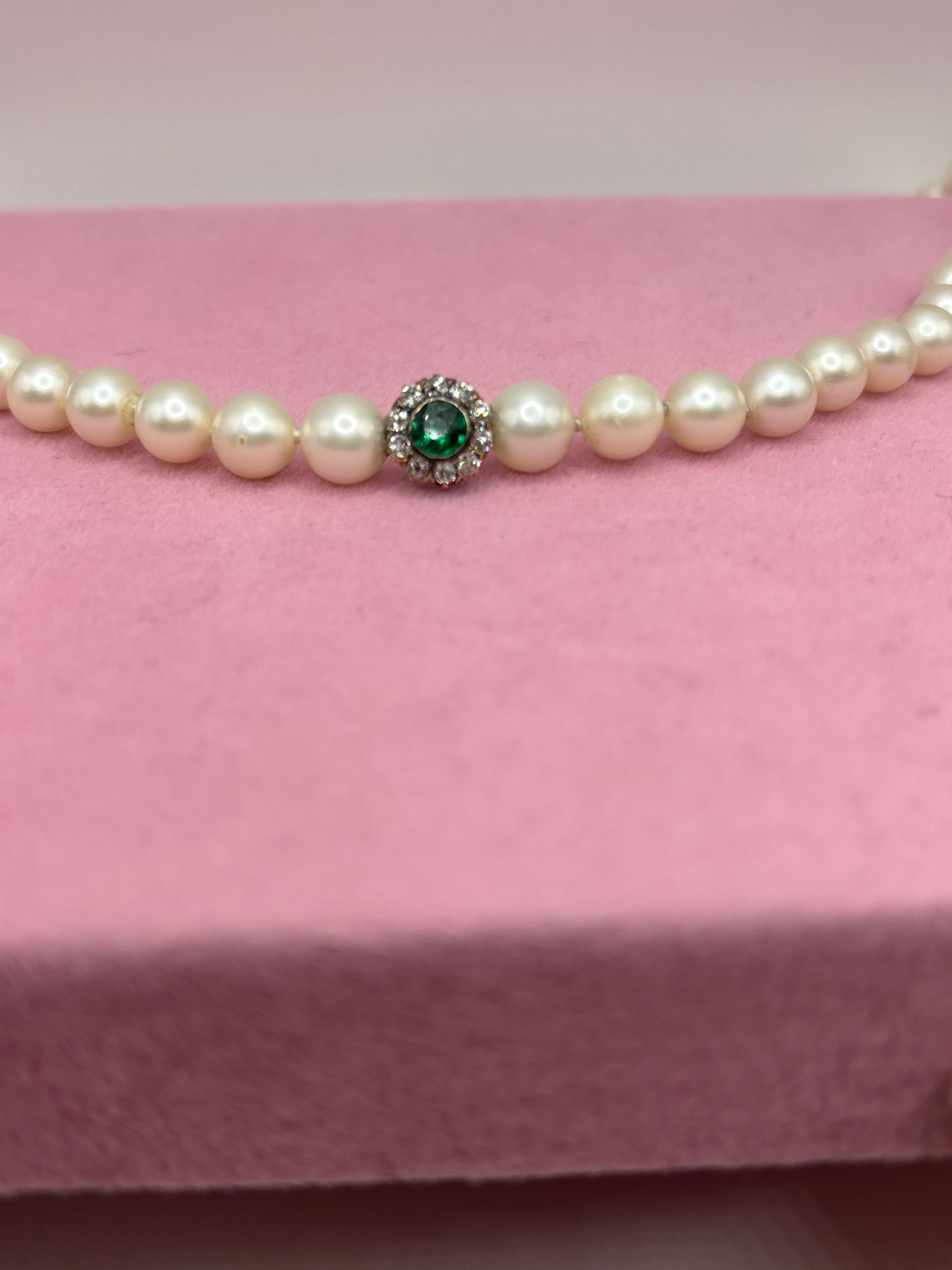 The centerpiece of this 15.5” graduated antique cultured pearl choker is a stunning untreated natural emerald surrounded by diamond halo old cut earth mined diamonds. The clasp is 14k white gold. One of a kind, heirloom piece of jewelry.