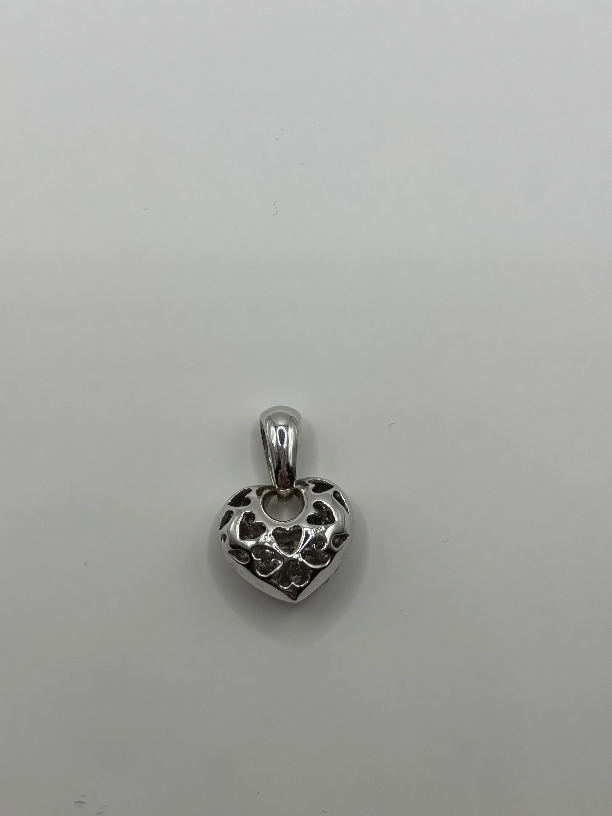This is sparkle bomb puffed heart filigree pendant is set in luxurious 18k white gold and is adorned with 1.25 cts of VS earth mined diamonds. It weighs 4.5 gr and is 0.80” tall. The bale is 6 mm long and will fit a 3 mm thick chain.