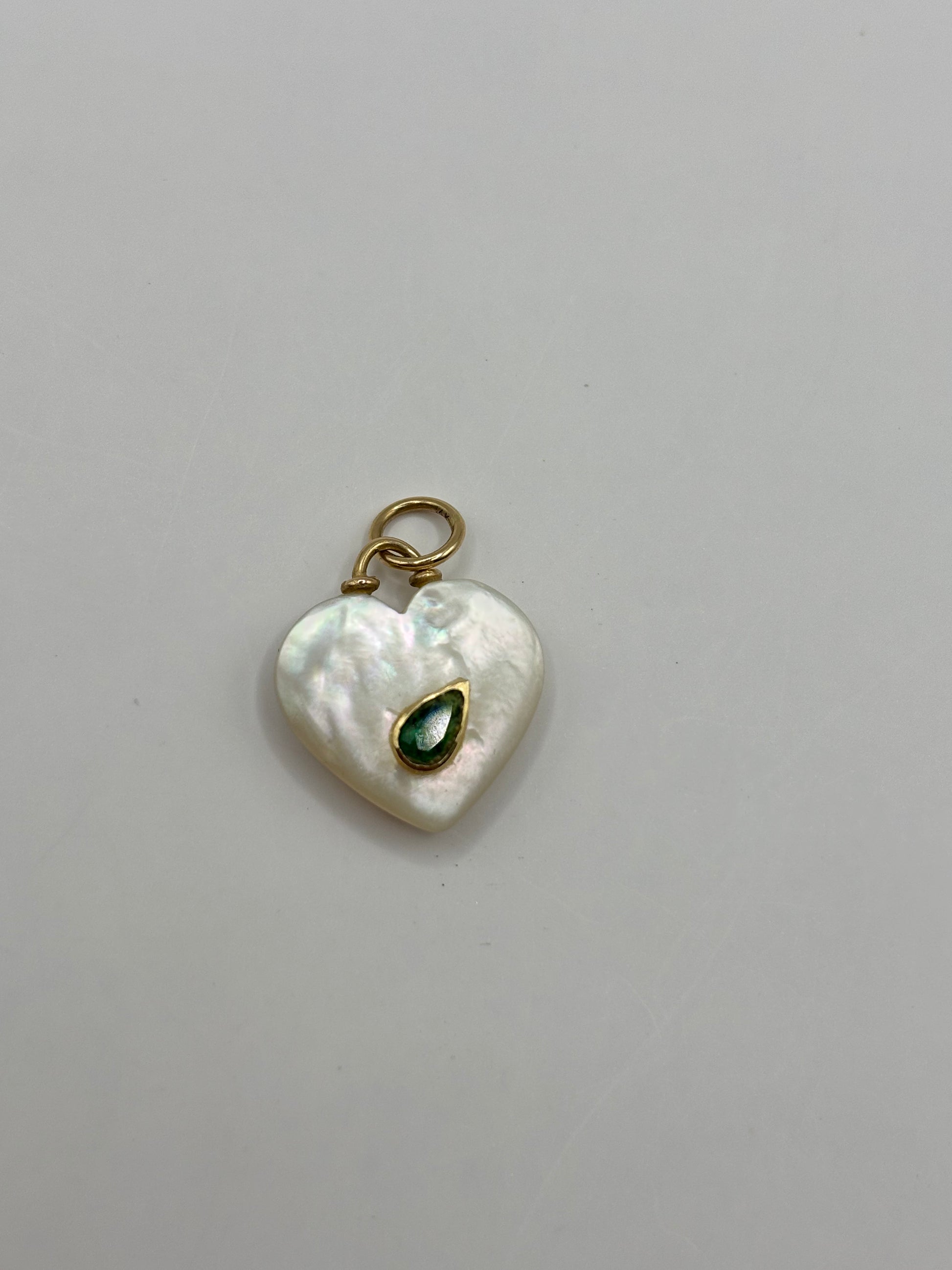 Beautiful heart shaped pearl pendant with a gold bezeled pear cut emerald accent. All 14k gold details.